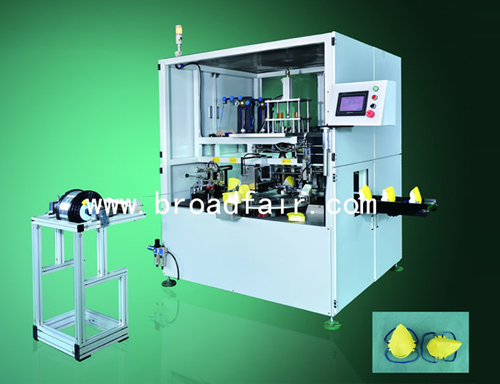 立体口罩耳带熔接机为全自动化生产立体防尘口罩的机器,从立体口罩本体入料、铝条鼻线的加热、切断、粘贴到头挂带的切断及通过超声波焊接,以及成品口罩的收集均一条线自动化作业;使用一个操作员即可操作整台机器。