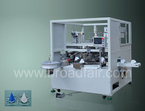 立体口罩头挂熔接机为继立体口罩本体后,采用超声波焊接的方式将松紧带按头挂方式熔合于口罩两侧,仅需一名操作员将口罩本体一个个置放于模具上,从塑料鼻线焊接到松紧带焊接均由设备自动完成。