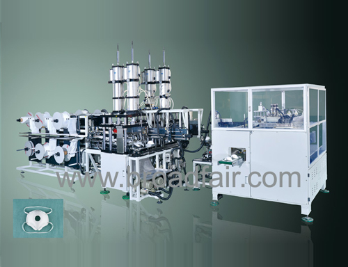 此机器用于生产适用于高污染工业用的杯型口罩,口罩本体部分可使用6-10层的PP无纺布及过滤材料。从多层原材料布料卷入料、热熔成型、冲切杯体、杯体定位及Logo印刷再到鼻线自动上料,熔接、耳带的熔接以及呼吸阀冲孔直至制成一个完整的杯型口罩均为一条线自动化作业。机器运动过程不会破坏材料的特性,口罩过滤效果可达N95标准。